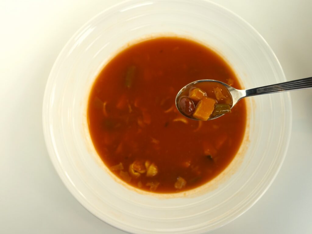 野菜を美味しく、タップリと取りたい方にオススメのスープ。ズッキーニ、トマト、ニンジン、セロリなど8種類の野菜や豆がたっぷり入っています。