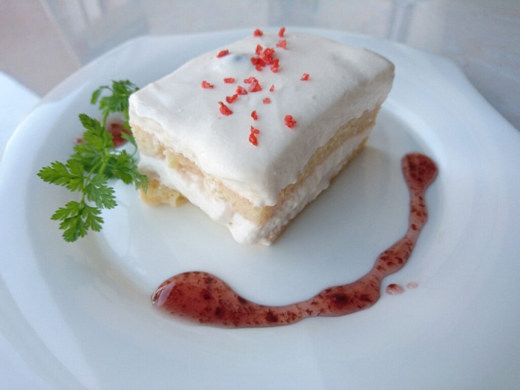 いちごのリキュールを使ったマスカルポーネムースといちごミルクシロップをうったスポンジの層になってます。