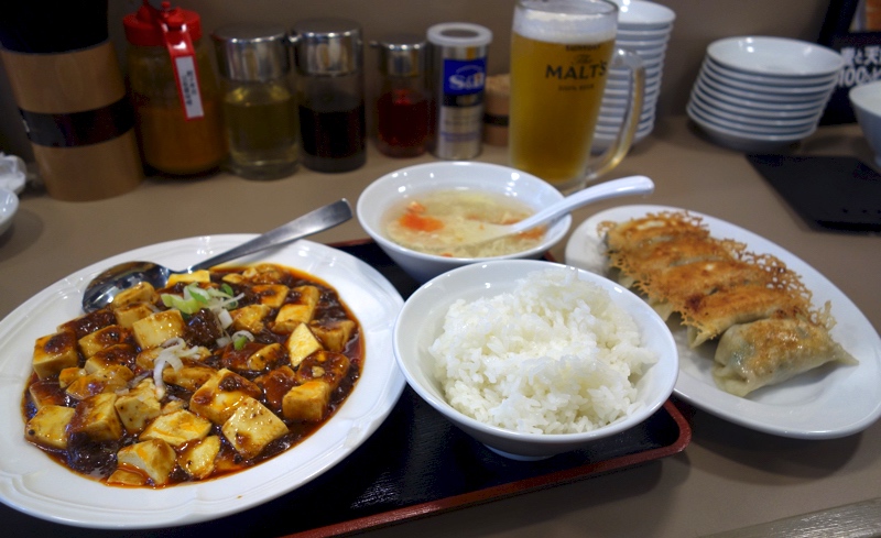 さて先ほどビールのあとに注文した麻婆豆腐+ギョウザとタマゴスープが出てきました。