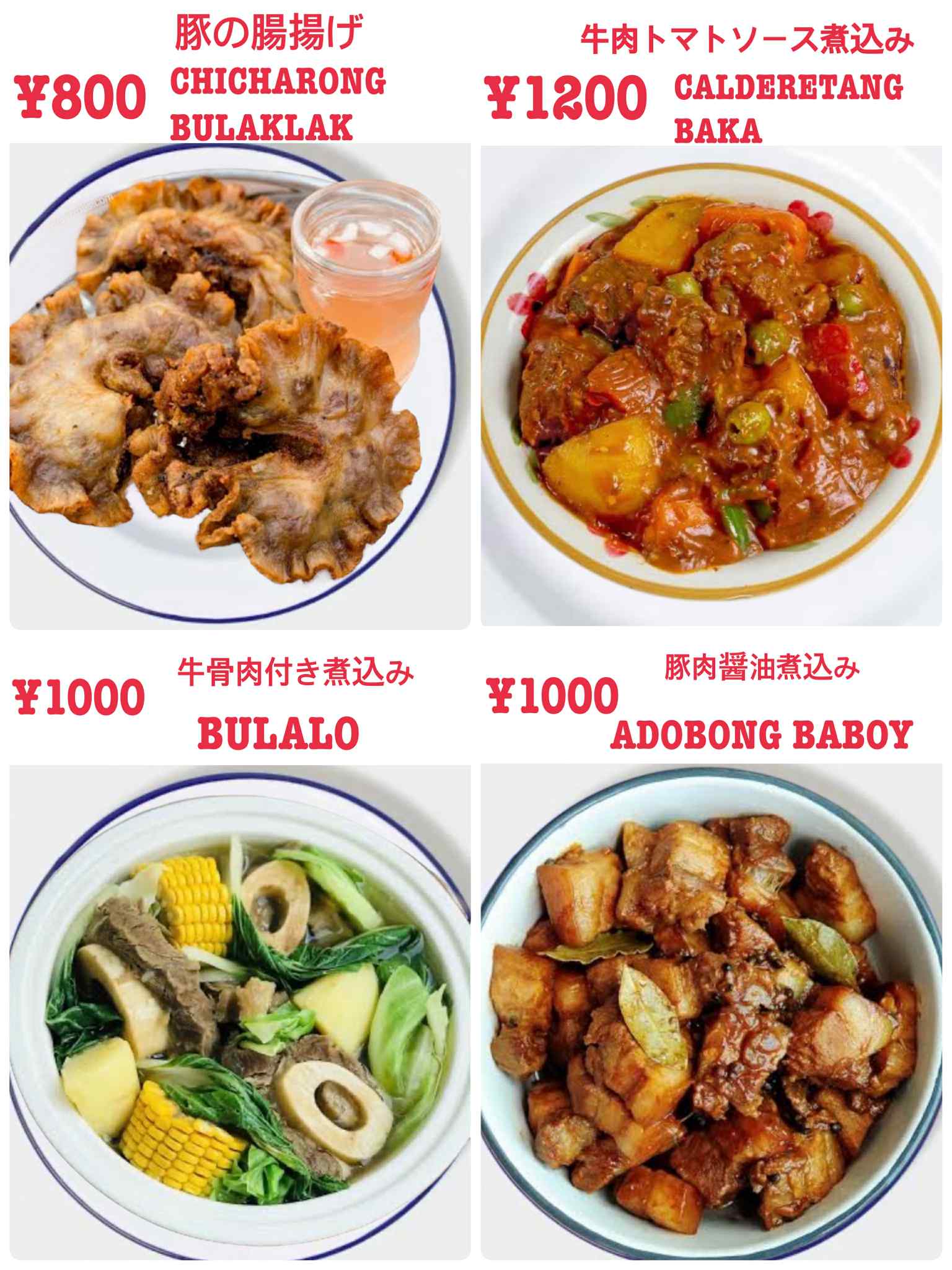 小岩フィリピン居酒屋、カラオケも楽しめるリーズナブルなお店『Venus』のフィリピン料理、豚の腸揚げ,Chicharong Bulaklak、牛肉トマトソース煮込み,Calderetang Baka、牛骨肉付き煮込み,Bulalo、豚肉醤油煮込み,Adobong Baboy