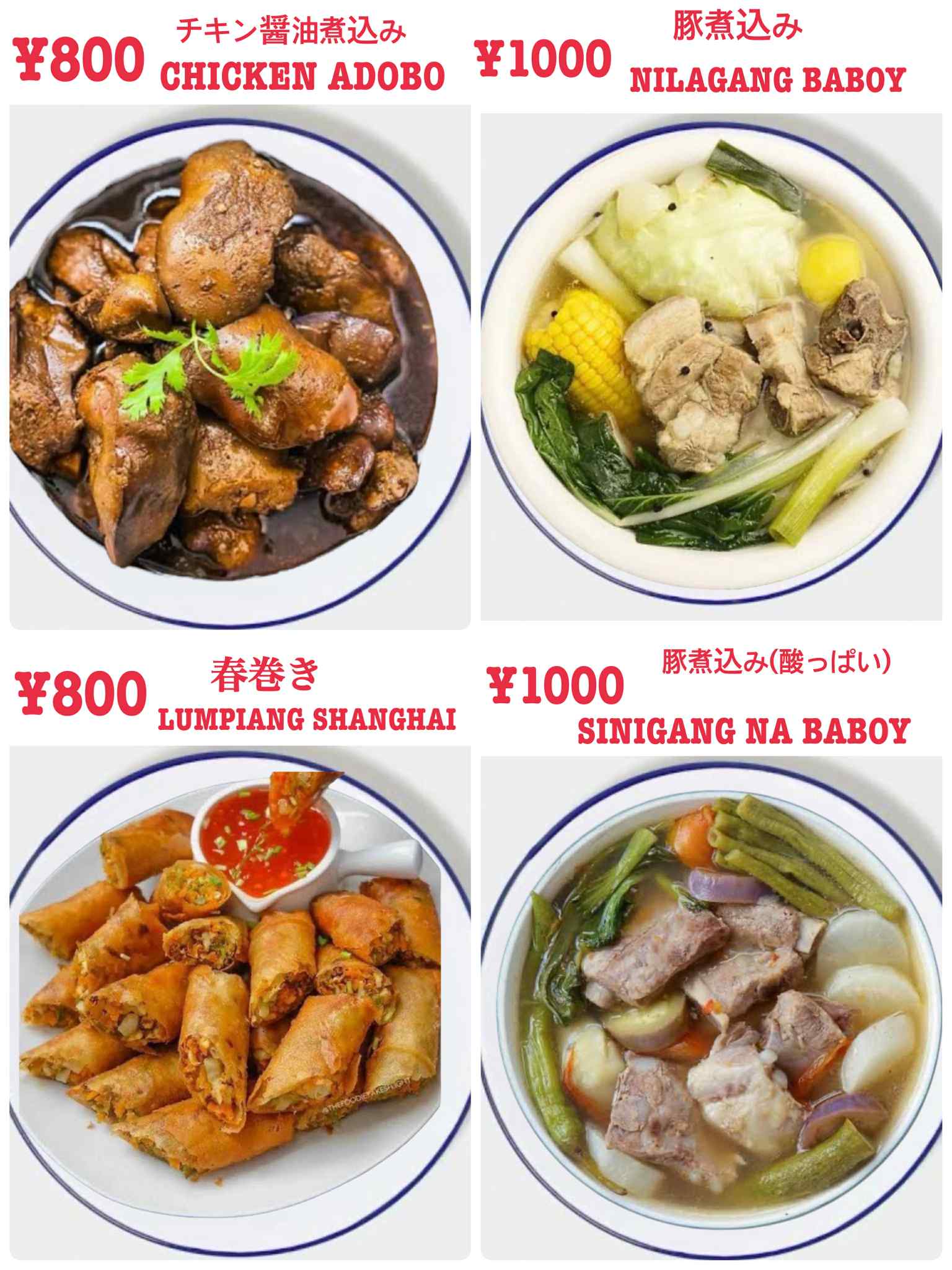 小岩フィリピン居酒屋、カラオケも楽しめるリーズナブルなお店『Venus』のフィリピン料理、チキン醤油煮込み,Chicken Adobo、豚煮込み,Nilagang Baboy、春巻き,Lumplang Shanghai、豚煮込み,Sinigang Na Baboy