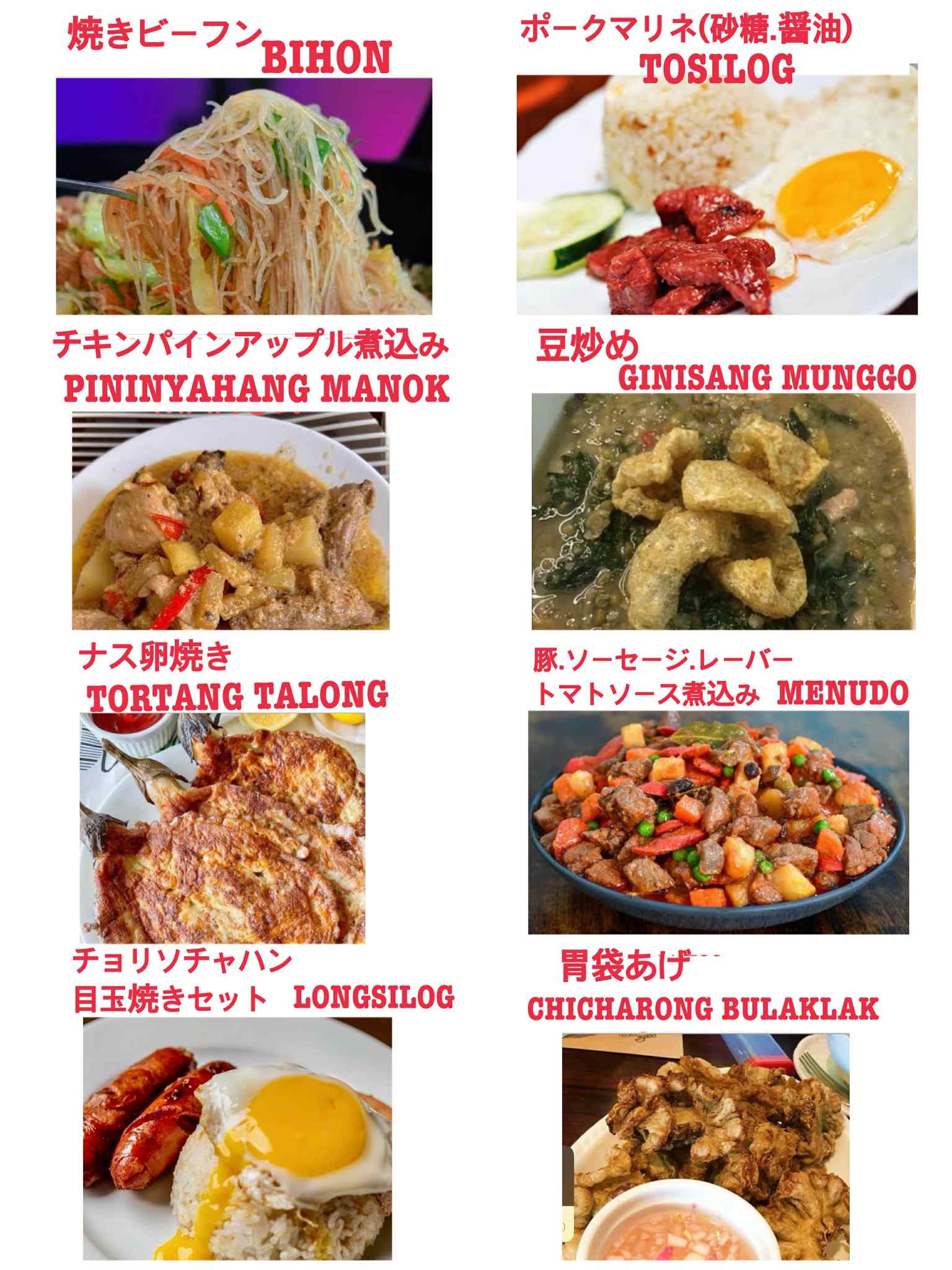 小岩フィリピン居酒屋、カラオケも楽しめるリーズナブルなお店『Venus』のフィリピン料理、焼きビーフン,Bihon、ポークマリネ,Tosilog、チキンパインアップル煮込み,Pininyahang Manok、豆炒め,Ginisang Munggo、茄子玉子焼き,Tortang Talong、ミノド豚ソーセージレバートマトソース煮込み,Menudo、チョリソーチャーハン目玉焼きセット,Longsilog、胃袋揚げ,Chicharong Bulaklak