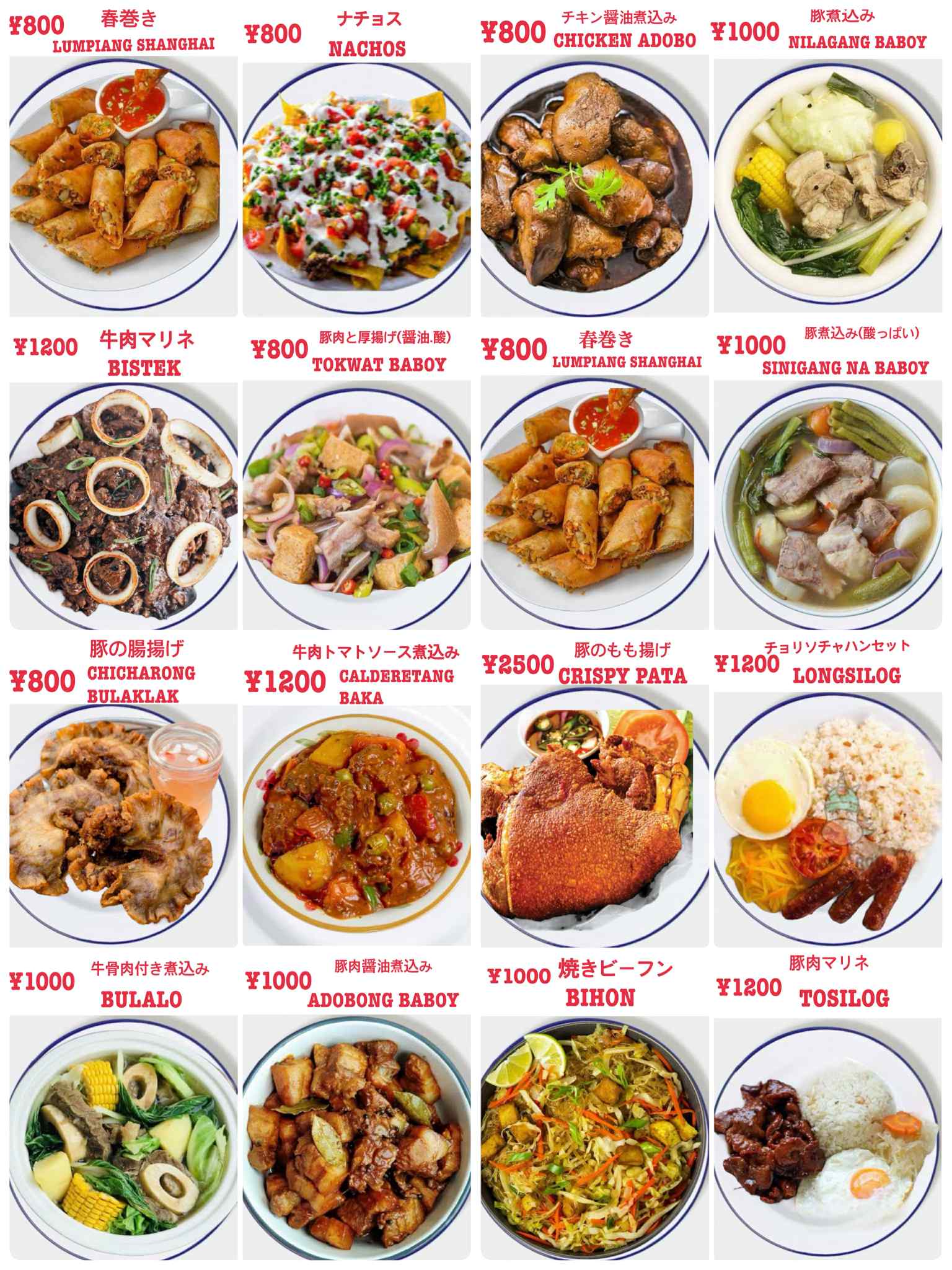小岩フィリピン居酒屋、カラオケも楽しめるリーズナブルなお店『Venus』のフィリピン料理、春巻き,Lumplang Shanghai、ナチョス,Nachos、チキン醤油煮込み,Chicken Adobo、豚煮込み,Nilagang Baboy、牛肉マリネ,Bistek、豚肉と厚揚げ,Tokwat Baboy、豚肉煮込み(酸味系),Sinigang Na Baboy、豚の腸揚げ,Chicharong Bulaklak、牛肉トマトソース煮込み,Calderetang Baka、豚のもも揚げ,Crispy Pata、チョリソーチャーハンセット,Longsilog、牛骨付き煮込み,Bulalo、豚肉醤油煮込み,Adobong Baboy、焼きビーフン,Bihon、豚肉マリネセット,Tasilog