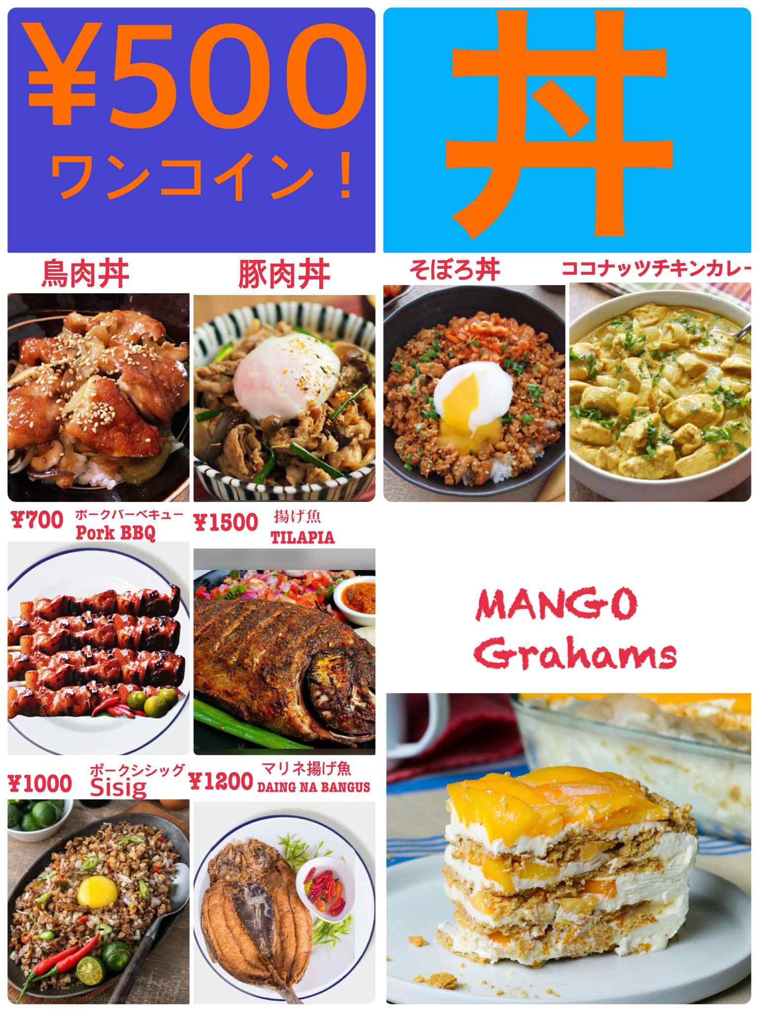 小岩フィリピン居酒屋、カラオケも楽しめるリーズナブルなお店『Venus』のフィリピン料理、ランチに嬉しいワンコイン丼、鶏肉丼、豚肉丼、そぼろ丼、ココナッツチキンカレー、ボークバーベキュー,Pork BBQ、上げ魚,TILAPIA、ポークシシグ,Pork Sisig、揚げ魚マリネ,Daing Na Bangus、マンゴーケーキ,Mango Grahams